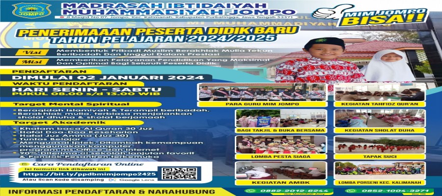 MI Muhammadiyah Jompo Telah Membuka Pendaftaran Peserta Didik Baru Tahun Ajaran 2024/2025. Syarat Pendaftaran: 1.Usia Peserta didik Minimal 6 tahun 0 Bulan per 17